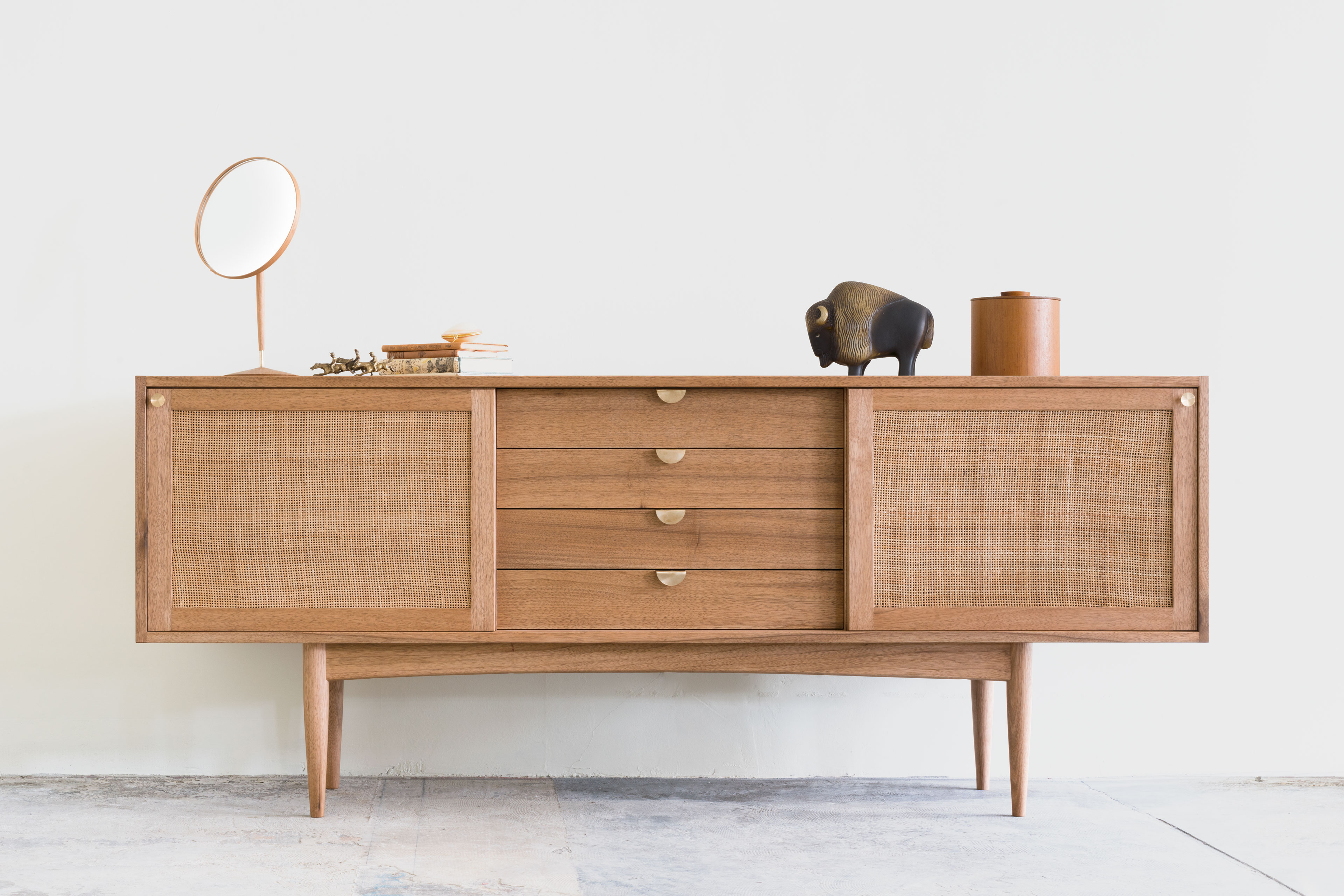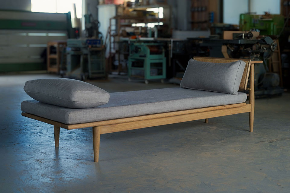 無垢材と籐の組み合わせで展開する4タイプのベッドフレーム。上質な自然素材の寝具もラインナップしています。